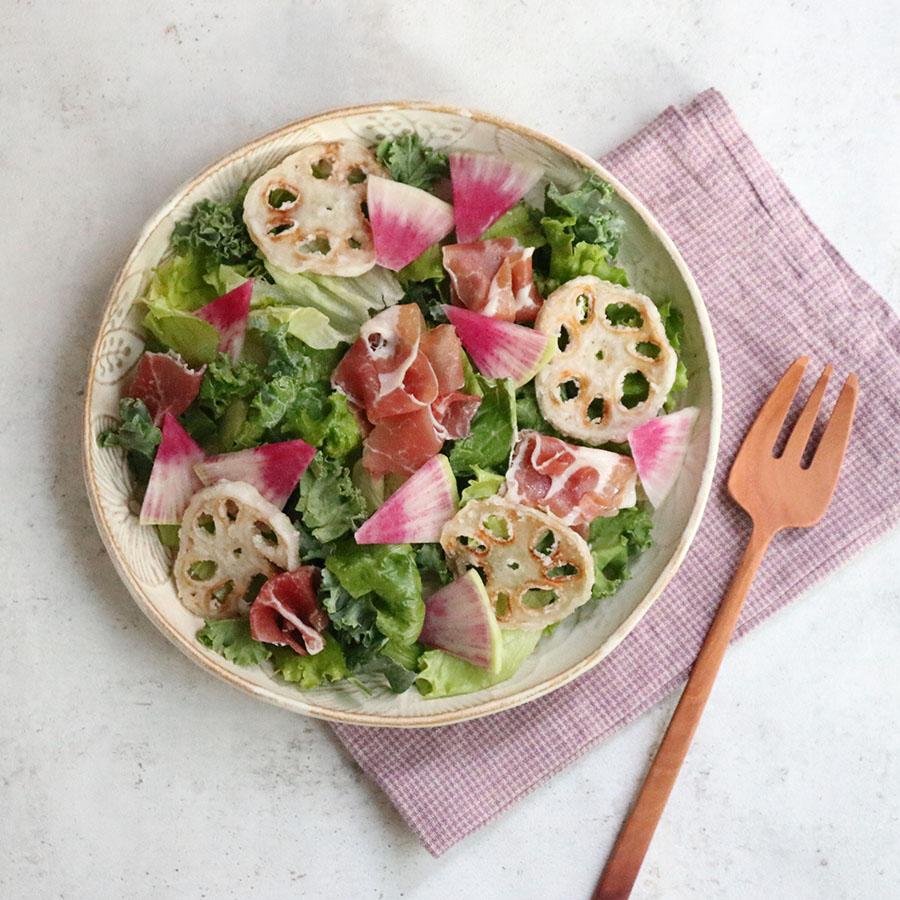 ①れんこんは薄切りにし、片栗粉をまぶす。熱したフライパンに多めのサラダ油をひき、れんこんを両面焼く。 ②お皿に「旬を味わうサラダ 紅芯大根やケール」を盛り、①、生ハムを盛りつけドレッシングをかけて完成!