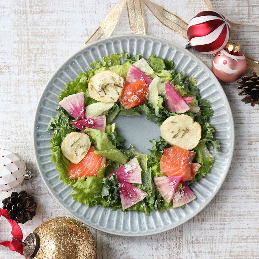 ②お皿に「旬を味わうサラダ 紅芯大根やケール」をリース状に盛りつけ、①とサーモンを盛り、粉チーズとドレッシングをかけて完成!