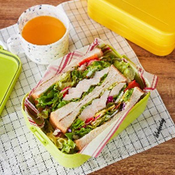 ②食パンに「10品目のサラダ レタスやパプリカ」、サラダチキンをのせて食パンを重ねラップでしっかりと包む。